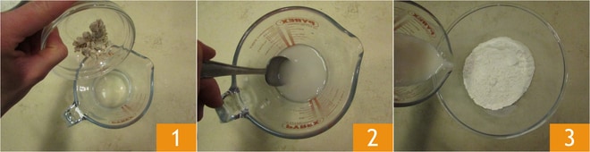 Um den herzhaften Kranz mit Käse und Rübstiel zuzubereiten, lösen Sie die Hefe 1 im Wasser 2 auf und fügen Sie sie dem Manitoba-Mehl 3 hinzu.
