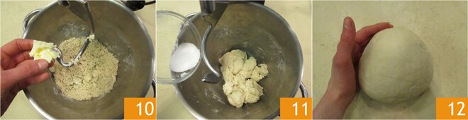 Kneten Sie, bis die Zutaten vermischt sind, und fügen Sie dann nach und nach die Butter 10 hinzu. Sobald alles vermischt ist, fügen Sie das Salz 11 hinzu und kneten Sie, bis es vollständig absorbiert ist. Arbeiten Sie einige Sekunden mit den Händen, formen Sie eine Kugel 12.