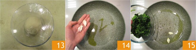 Legen Sie den Teig in eine Schüssel und decken Sie ihn mit Folie ab 13. Lassen Sie ihn bei etwa 26°C für 1 Stunde gehen. In der Zwischenzeit erhitzen Sie das Öl in einer Pfanne, fügen Sie die Knoblauchzehen 14 hinzu und dann den Rübstiel 15, braten Sie ihn für einige Minuten an.