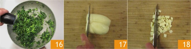 Salzen Sie und stellen Sie ihn beiseite 16. Schneiden Sie die Provola in Streifen 17 und dann in kleine Würfel 17, anschließend hacken Sie sie 18.
