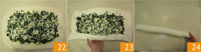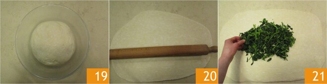 Nehmen Sie den gegangenen Teig 19 und rollen Sie ihn auf etwa 4 mm Dicke aus, um ein Rechteck von etwa 35 x 50 cm zu erhalten 20. Füllen Sie die gesamte Oberfläche mit dem Rübstiel 21.