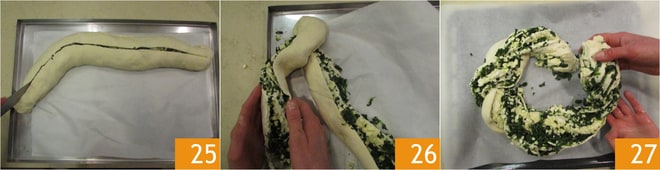 Legen Sie die Rolle auf ein mit Backpapier ausgelegtes Blech, schneiden Sie sie entlang der langen Seite ein 25, lassen Sie ein Ende intakt, flechten Sie die zwei Enden, indem Sie sie übereinander legen und die Füllung nach oben halten 26. Am Ende des Flechtens formen Sie eine Art Kranz, indem Sie die beiden Enden zusammenfügen und mit den Fingern Druck ausüben 27.