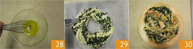 Machen Sie eine Emulsion aus Wasser und Öl 28. Bestreichen Sie damit die Oberfläche 29 und backen Sie im vorgeheizten Ofen bei 180°C Ober-/Unterhitze für 60 Minuten. Legen Sie ein Blech über den Kranz, um zu verhindern, dass die Heizspirale des Ofens die Oberfläche zu stark färbt, entfernen Sie es dann 15 Minuten vor Ende des Backens, um die Zubereitung leicht zu färben. Nehmen Sie den herzhaften Kranz mit Käse und Rübstiel aus dem Ofen und servieren Sie ihn lauwarm 30.