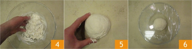 Kneten Sie mit den Händen 4. Bewegen Sie sich auf die Arbeitsfläche und formen Sie eine runde Kugel 5, legen Sie sie in die Schüssel, decken Sie sie mit Folie ab 6. Lassen Sie den Teig 1 Stunde bei Raumtemperatur oder im ausgeschalteten Ofen bei 26°C gehen, bis sich das Volumen verdoppelt hat.