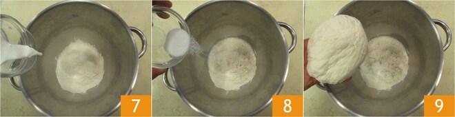 Gießen Sie in die Rührmaschine mit dem Haken das 00-Mehl, die Milch 7, den Zucker 8 und den zuvor gegangenen Teig 9.