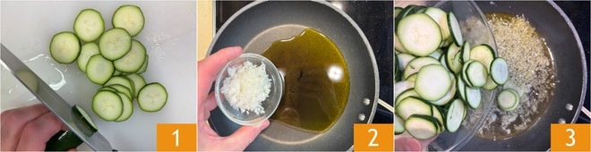 Um den herzhaften Kuchen aus Filoteig in der Pfanne mit Zucchini zuzubereiten, entfernen Sie zunächst die Enden der Zucchini und schneiden Sie sie in Scheiben 1. Erhitzen Sie einen Schuss Öl in einer Pfanne, fügen Sie die fein gehackte Zwiebel hinzu 2 und braten Sie sie für einige Minuten an, dann geben Sie die Zucchini hinzu 3 und kochen Sie sie bei mittlerer Hitze etwa 5 Minuten lang.