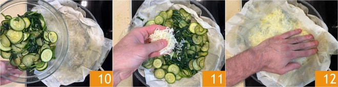 Fügen Sie die Zucchini mit dem Spinat 10 und den geriebenen Käse hinzu 11. Decken Sie mit den anderen Filoteigblättern ab, die zuvor bestrichen wurden 12.