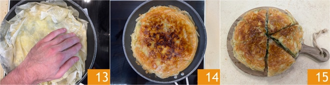 Falten Sie die Ränder nach innen 13 und kochen Sie bei schwacher Hitze etwa 5-6 Minuten, dann drehen Sie ihn wie ein Omelett um 14 und kochen Sie weitere 5-6 Minuten, bis der Teig goldbraun und knusprig ist. Ihr herzhafter Kuchen aus Filoteig mit Zucchini ist bereit, genossen zu werden 15!