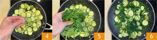 Mit Salz abschmecken 4, umrühren und dann den Spinat hinzufügen 5 und weitere 5 Minuten kochen oder bis die Zucchini weich sind 6 und beiseite stellen.