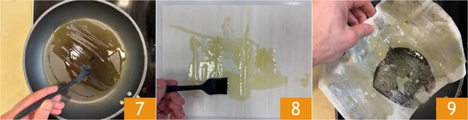 Bestreichen Sie eine Pfanne mit Öl 7 und 4-5 Blätter Filoteig auf beiden Seiten 8, dann legen Sie sie in die Pfanne 9, sodass der Boden bedeckt ist.