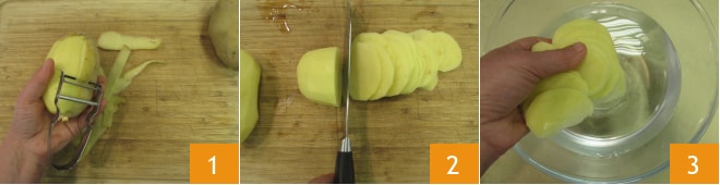 Um den herzhaften Kuchen mit Kartoffeln und Mortadella zuzubereiten, schälen Sie zunächst die Kartoffeln 1. Schneiden Sie sie in 3-4 mm dicke Scheiben 2 und legen Sie sie dann in eine Schüssel mit kaltem Wasser, um sie beiseite zu stellen 3.