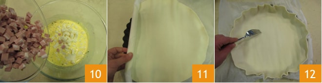 Fügen Sie auch den gewürfelten Käse und die Mortadella hinzu 10, mischen Sie alles. Rollen Sie den Blätterteig mit dem Backpapier in eine gewellte Form (deren Boden 26 cm misst, die Oberfläche 28 cm) 11. Stechen Sie den Boden mit einer Gabel ein 12.