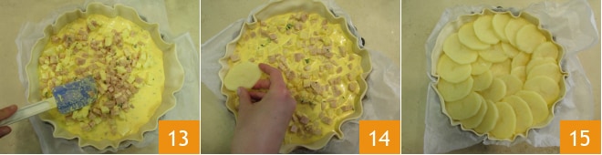 Gießen Sie die Füllung ein und verteilen Sie die Würfel 13. Lassen Sie die Kartoffeln abtropfen und verteilen Sie sie auf der Oberfläche, indem Sie zuerst einen Kreis bilden 14 und darunter die anderen Scheiben ebenfalls kreisförmig anordnen 15.