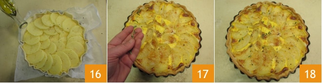 Garnieren Sie die Oberfläche mit etwas Öl 16, Salz, Pfeffer und zum Schluss mit geriebenem Käse. Backen Sie bei 180° in einem vorgeheizten statischen Ofen für 60 Minuten im unteren Regal. Lassen Sie den herzhaften Kuchen mit Kartoffeln und Mortadella abkühlen, bevor Sie noch etwas Thymian 17 hinzufügen und ihn genießen 18.