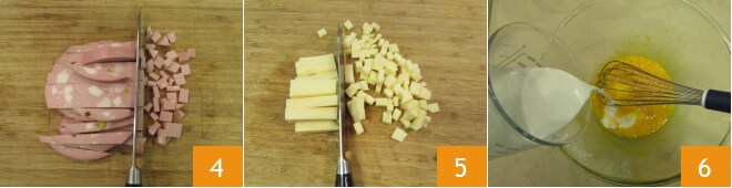 Schneiden Sie die Mortadella 4 und den Käse 5 in Würfel. In einer Schüssel die Eier mit der Sahne 6 verarbeiten.