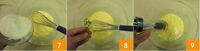 Fügen Sie den geriebenen Pecorino 7, die Thymianblätter 8, Salz und Pfeffer 9 hinzu.