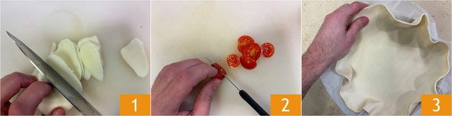 Um den herzhaften Kuchen mit Kirschtomaten und Scamorza zuzubereiten, schneiden Sie zuerst sowohl die Scamorza 1 als auch die Kirschtomaten 2 in Scheiben. Legen Sie den Blätterteig mit dem Backpapier in eine Backform mit einem Durchmesser von 24 cm 3.