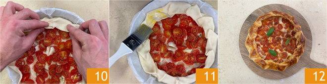 Klappen Sie die Ränder des Blätterteigs nach innen 10 und bestreichen Sie sie mit dem verquirlten Ei 11. Backen Sie im statischen Ofen bei 200°C für 25-30 Minuten, bis der Blätterteig goldbraun und knusprig ist. Abschließend mit ein paar Basilikumblättern garnieren. Ihr herzhafter Kuchen mit Kirschtomaten und Scamorza ist bereit zum Genießen 12!