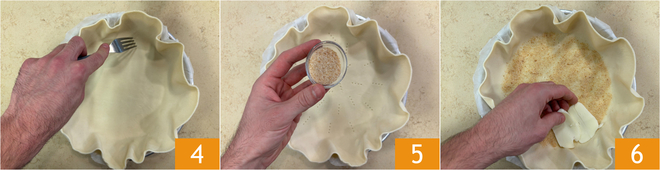 Stechen Sie den Boden mit den Zinken einer Gabel ein, so dass er beim Backen nicht aufgeht 4. Bestreuen Sie den Boden mit Paniermehl 5 und fügen Sie dann die Scamorza hinzu 6.