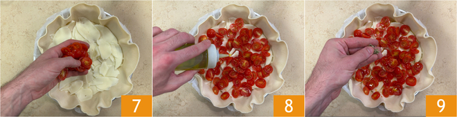 Verteilen Sie die Kirschtomaten 7, dann würzen Sie mit Öl 8, Salz, Pfeffer und Oregano 9.