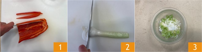 Um den herzhaften Paprika-Ricotta-Kuchen vorzubereiten, putzen Sie die Paprika, entfernen Sie den Stiel und die inneren Samen, und schneiden Sie sie dann in gleichmäßige Würfel von etwa 2 cm 1. Putzen und schneiden Sie die Frühlingszwiebel 2 3.