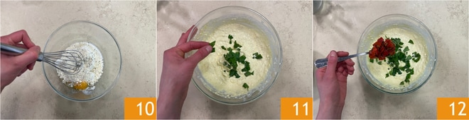 Salzen, pfeffern und mit einem Schneebesen mischen 10. Würzen Sie mit dem zerkleinerten Basilikum 11, fügen Sie die Paprika hinzu 12.