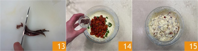 Dann die Sardellen abtropfen lassen, in Stücke schneiden 13 und zur Füllung hinzufügen 14. Mischen Sie, um alles zu verbinden 15.