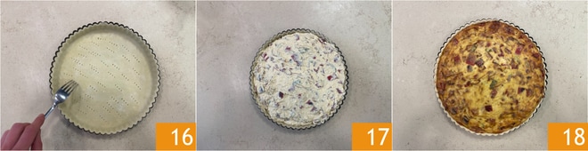 Legen Sie eine 23 cm große Form mit dem Mürbeteig aus, stechen Sie den Boden mit einer Gabel ein 16, gießen Sie die Füllung hinein und glätten Sie sie mit dem Rücken eines Löffels 17. Backen Sie im vorgeheizten statischen Ofen bei 180 Grad für 55 Minuten: In den ersten 35 Minuten auf der mittleren bis unteren Schiene des Ofens, dann den Kuchen auf eine höhere Schiene stellen, um ihn zu färben und so das Backen zu beenden. Nehmen Sie den herzhaften Paprika-Ricotta-Kuchen heraus und lassen Sie ihn abkühlen, bevor Sie ihn servieren 18.