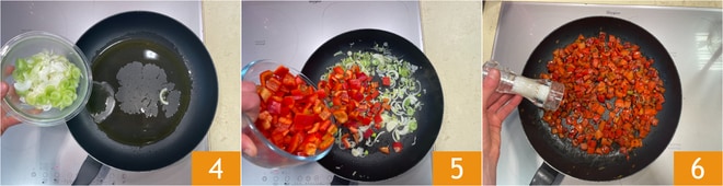 Erhitzen Sie eine Pfanne mit einem Schuss Olivenöl, fügen Sie die Frühlingszwiebel 4 und die Paprika hinzu 5, braten Sie sie in der Pfanne etwa 8 Minuten lang an. Salzen Sie 6 und lassen Sie sie abkühlen.