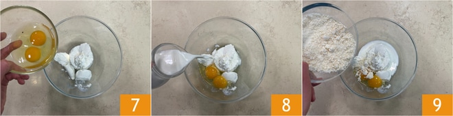 Bereiten Sie die Füllung vor: In einer Schüssel Ricotta, Eier 7, Milch 8 und Grana Padano 9 vermischen.