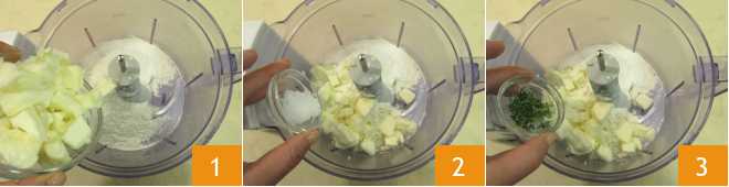 Um die herzhafte Torte mit Stockschwämmchen zuzubereiten, bereiten Sie zunächst den salzigen Mürbeteig vor: Geben Sie in eine Küchenmaschine mit Stahlklingen das Mehl und die kalte Butter aus dem Kühlschrank 1, dann fügen Sie das grobe Salz 2 und den Thymian 3 hinzu.