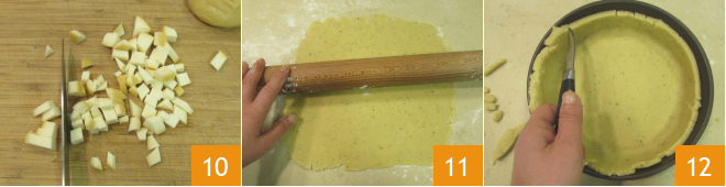 Schneiden Sie den Scamorza in Würfel 10. Nach der Ruhezeit rollen Sie den Mürbeteig auf einer leicht bemehlten Fläche auf eine Dicke von 5-6 mm aus 11 und legen Sie eine Form mit einem Durchmesser von 20 cm am Boden und 22 cm an der Oberfläche aus, indem Sie den überschüssigen Teig mit einem Messer entfernen 12.