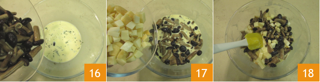 Fügen Sie auch die Pilze 16 und die Scamorza-Würfel 17 hinzu, dann gut mischen, um alles zu vermengen 18.