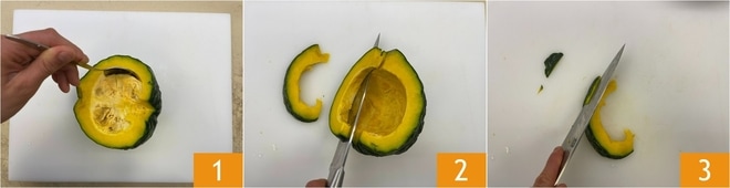 Um den herzhaften Kürbis-Mozzarella-Kuchen zuzubereiten, schneiden Sie zuerst den Kürbis in zwei Hälften und entfernen Sie die Kerne 1. Dann schneiden Sie ihn in dicke Scheiben 2 und entfernen Sie die Schale mit einem Messer 3.