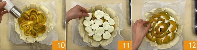 Würzen Sie mit Salz 10 und legen Sie die in Scheiben geschnittene Mozzarella darauf 11. Beenden Sie mit dem restlichen Kürbis 12.