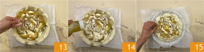 Fügen Sie den geriebenen Käse hinzu 13, einen Schuss Öl 14 und falten Sie die Ränder des Blätterteigs nach innen zum Füllung hin 15.