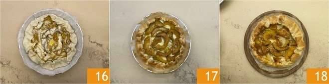 Stechen Sie den Boden mit den Zinken einer Gabel ein 7 und bestäuben Sie den Boden mit Maismehl 8; dies wird dazu dienen, eventuelle Flüssigkeiten des Mozzarellas und des Kürbisses zu absorbieren. Legen Sie nun die Kürbisscheiben 9 darauf.
