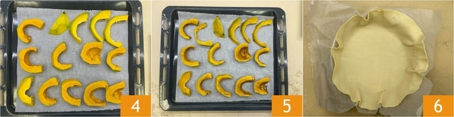 Legen Sie die Kürbisscheiben nach und nach auf ein mit Backpapier ausgelegtes Backblech 4 und backen Sie sie in einem vorgeheizten Umluftofen bei 200° für 15 Minuten. Wenn der Kürbis weich ist, können Sie ihn aus dem Ofen nehmen 5. Lassen Sie ihn abkühlen und schneiden Sie in der Zwischenzeit den Mozzarella in Scheiben und legen Sie ihn auf ein Tablett mit Küchenpapier. Rollen Sie den Blätterteig in eine Tortenform mit einem Durchmesser von 22 cm an der Basis und 26 cm am oberen Rand 6.