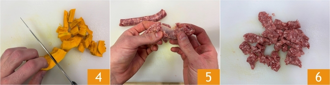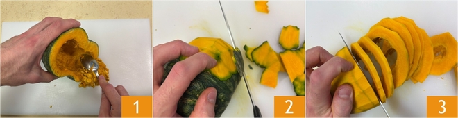 Um den herzhaften Strudel mit Kürbis und Wurst zuzubereiten, beginnen Sie mit der Reinigung des Kürbisses: Entfernen Sie die inneren Kerne mit einem Löffel 1, dann schälen Sie die äußere Schale mit einem scharfen Messer 2 oder einem starken Sparschäler. Schneiden Sie etwa 1 cm dicke Scheiben 3.