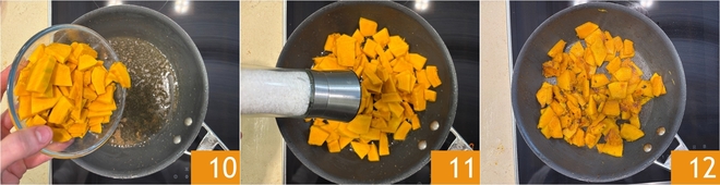Stellen Sie sie beiseite und geben Sie in dieselbe Pfanne die Kürbiswürfel 10. Fügen Sie Salz 11, Pfeffer hinzu und kochen Sie bei starker Hitze etwa 5 Minuten, damit sie außen goldbraun, aber innen weich bleiben. Sobald der Kürbis gekocht ist, 12 lassen Sie ihn etwas abkühlen.