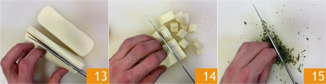 Nehmen Sie den Schnittkäse und schneiden Sie ihn zunächst in Scheiben 13, dann in Stifte und schließlich in etwa 2 cm große Würfel 14. Hacken Sie ein paar Salbeiblätter und einen Rosmarinzweig fein 15.