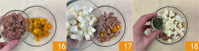 Sammeln Sie alles in einer großen Schüssel: den Kürbis, die Wurst 16, den Schnittkäse 17 und die gehackten Kräuter 18.