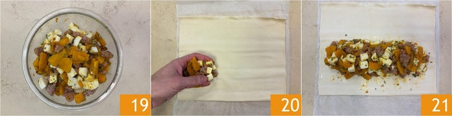Mischen Sie, um eine gut vermengte Masse zu erhalten 19. Jetzt rollen Sie den Blätterteig auf der Arbeitsfläche aus, geben die Füllung in die Mitte 20 und drücken Sie sie leicht zusammen, um eine gleichmäßige, zylindrische Form zu erhalten 21.