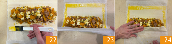 Bestreichen Sie die Ränder mit verquirltem Eigelb 22, dann schließen Sie den Teig: Heben Sie die erste Seite an 23 und legen Sie sie auf die Füllung 24.