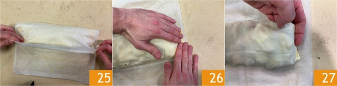 Machen Sie dasselbe mit der anderen Teigkante und bedecken Sie die Füllung vollständig 25, indem Sie drücken, um sie zu befestigen. Versiegeln Sie die Enden gut, indem Sie sie zusammenkneifen 26 und nach unten falten 27, um ein Auslaufen beim Backen zu vermeiden.