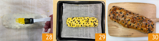 Bestreichen Sie die Oberfläche mit mehr Eigelb 28, streuen Sie Sesam- und Kürbiskerne darüber und legen Sie die Rolle auf ein mit Backpapier ausgelegtes Blech 29. Backen Sie im vorgeheizten statischen Ofen bei 180° für 25-30 Minuten, bis der Teig goldbraun und knusprig ist. Sobald er fertig ist, nehmen Sie ihn aus dem Ofen und lassen Sie Ihren herzhaften Strudel mit Kürbis und Wurst einige Minuten abkühlen, bevor Sie ihn servieren 30!