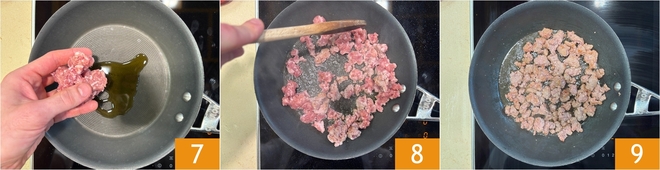 Geben Sie sie in eine große Pfanne mit einem Schuss heißem Olivenöl extra vergine 7 und rösten Sie sie bei starker Hitze für 4-5 Minuten, gelegentlich umrühren 8, bis sie gut gebräunt ist 9.