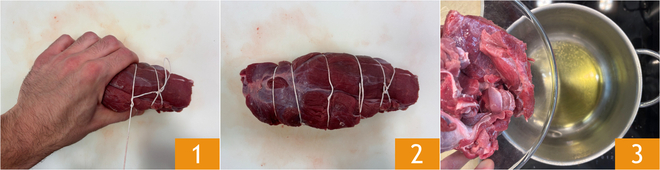 Um den Hirschbraten zuzubereiten, reinigen Sie als erstes das Fleisch, indem Sie das Fett und die Sehnen entfernen: Sie sollten ein kompaktes und gleichmäßiges Filet erhalten, um eine gleichmäßige Garung zu gewährleisten. Fahren Sie dann mit dem Wie man den Braten bindet fort: Nachdem Sie den ersten Knoten gemacht haben, erstellen Sie Schlaufen 1 und fahren Sie bis zum Ende des Fleisches fort, schließen Sie mit einem Knoten ab 2 und legen Sie es beiseite. Aus den Resten bereiten Sie den Fonds zu: Erhitzen Sie in einem Topf etwas Öl und fügen Sie die Fleischreste hinzu 3.