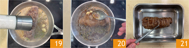 Sobald die untere Seite versiegelt ist, drehen Sie den Braten um und salzen Sie auch die andere Seite 19. Nappen Sie den Braten nun 20, das heißt, begießen Sie ihn ständig mit der geschmolzenen Butter, bis er gut gebräunt ist. Legen Sie den Braten in eine Auflaufform 21 und backen Sie ihn im statischen Ofen bei 80 °C für 10-15 Minuten. Die Kerntemperatur des Fleisches sollte 48 °C erreichen.