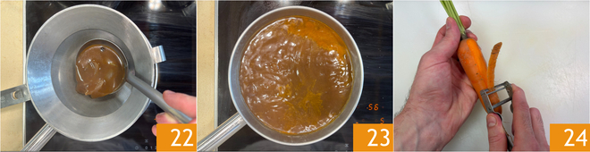 In der Zwischenzeit den Fonds durch ein Sieb in einen kleinen Topf filtern 22 und bei mittlerer Hitze weiter reduzieren lassen 23 für 10-15 Minuten. Für die Beilage entfernen Sie den überschüssigen grünen Teil der Karotten, lassen aber etwa 3 cm des Stiels stehen, dann schälen Sie sie 24.